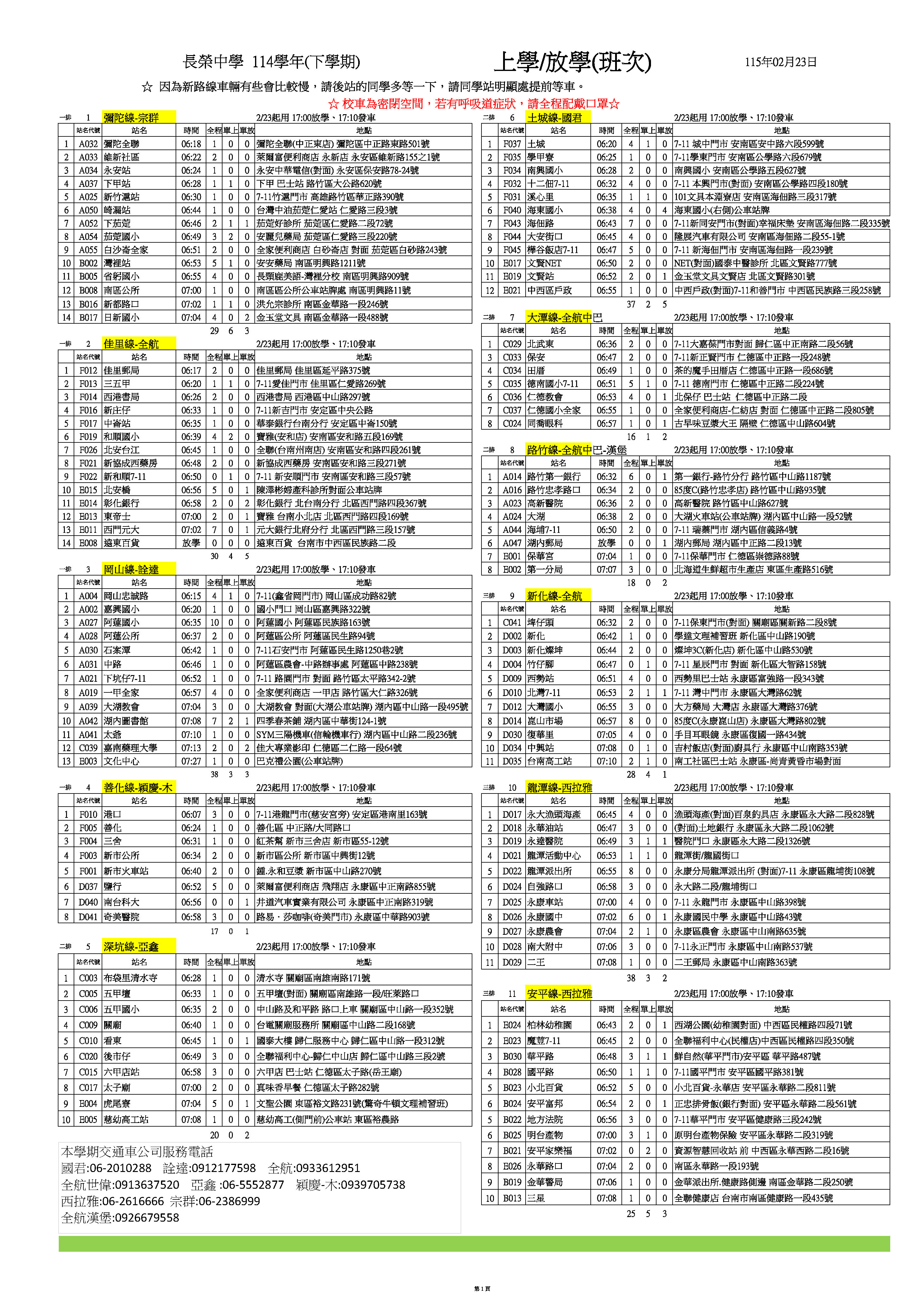 請配合司機核對名單,請同學注意路線及搭車時間提前10分鐘。